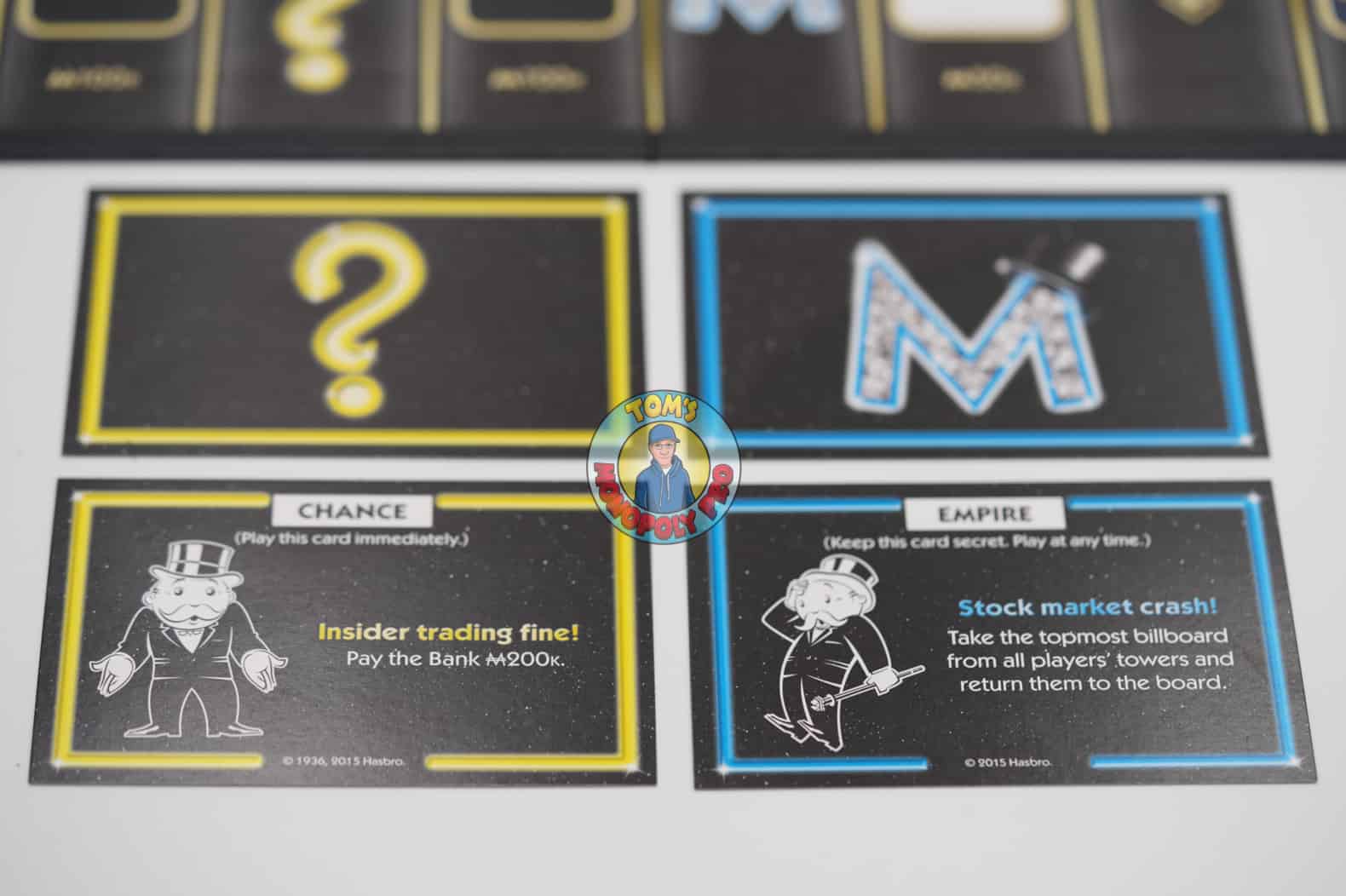 There are two types of cards with Monopoly Empire. You pick up a card depending on which space you fall on.