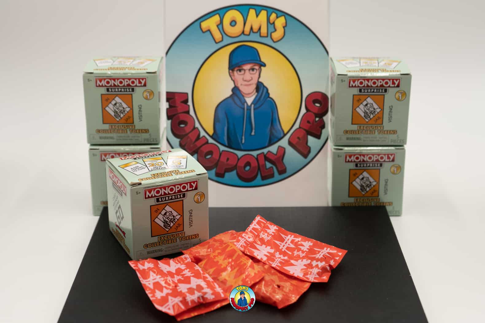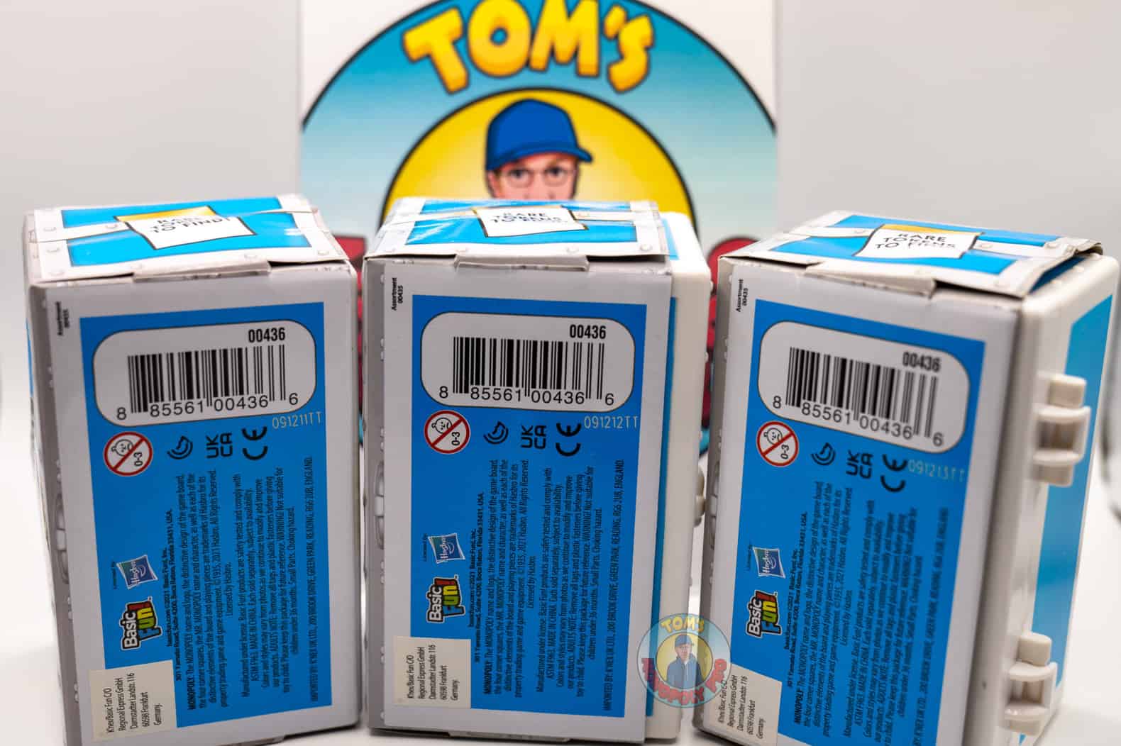 There are six different Monopoly Surprise boxes to collect. Each one of them has a unique serial number stamped at the bottom of each box. If you buy two boxes with the same serial number on them, you will get identical contents in both boxes!